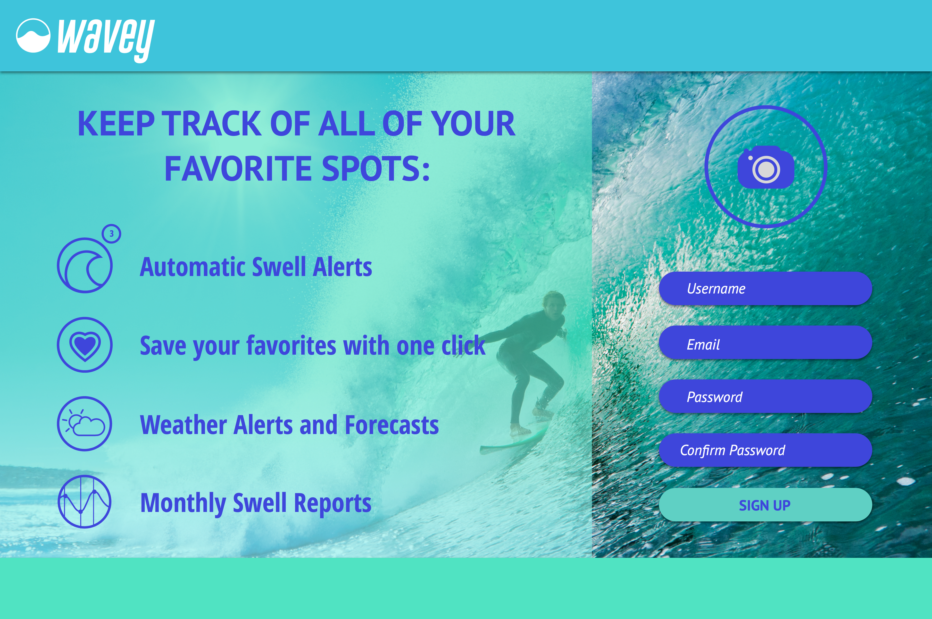 A Fresh take on swell report sites that are often outdated, have too much information crammed into small spaces, lack of hierarchy and distracting graphics.